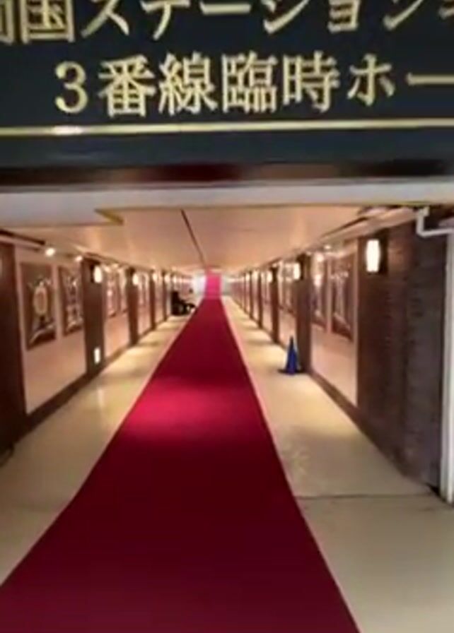 hallway covered by a long red carpet. There are framed pictures lining the walls on both sides. A person is sitting at the end of the hallway. The hallway appears to be indoors and leads to the entrance of a train station gallery.