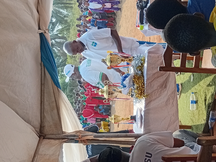 The image captures an outdoor awards ceremony or public event in Tuaniako, Nigeria. Under a white canopy tent supported by brown poles, a rectangular table covered with a white tablecloth holds three golden trophies, blue and white fabric elements, gold and silver tinsel garlands, and a white plate. Two adult Black males stand behind this table. The man on the left, wearing a white cap, dark sunglasses, and a white polo shirt with green and white trim and a chest logo, holds a microphone and appears to be speaking. The man on the right, with a shaved head and a white polo shirt featuring a blue circular logo, is looking down at the trophies. The ground beneath the tent is covered with artificial green turf, on which two plastic water bottles are visible. In the immediate foreground, the backs of three seated individuals are present: an adult in a white shirt with "OSU" printed on it and blue jeans, and two children in blue and yellow shirts, seated on wooden chairs. A second table, covered in blue, is partially visible on the far right. Beyond the tent, a large crowd of people, primarily children and young adults, stands on a reddish-brown dirt field. Many in the crowd wear distinct uniforms, including red, green, blue, and purple athletic attire. Dense green foliage and trees constitute the distant background under a bright sky.