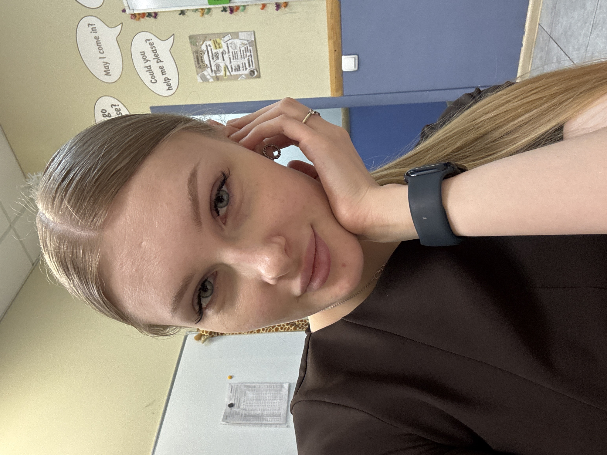 A fair-skinned young woman with light brown hair is shown in a selfie. She has her left hand raised near her face, and a smart watch on her left wrist. She is wearing a dark brown garment. The background shows a classroom setting with wall decorations, including speech bubbles and a notice board. The location may be Perm, Russia based on the prompt, but this is not visually confirmed in the image.