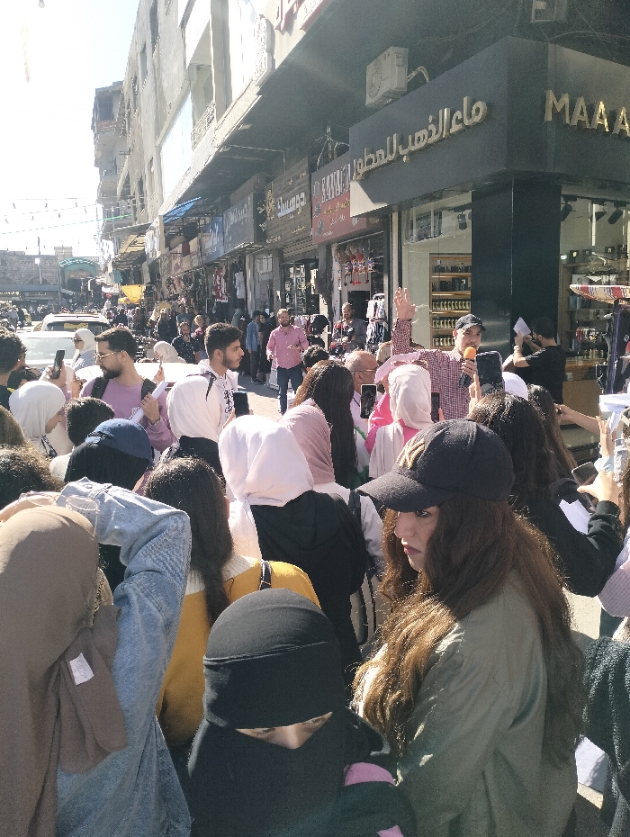 This image depicts a densely crowded commercial street in Hims, Syria, under bright daylight. The primary focus is a large gathering of people, predominantly young adults, observing a central figure. **Location:** The scene is set on a busy urban street. A prominent storefront on the right side of the image features a sign in Arabic, "ماء الذهب للعطور" (Maa Al-Dhahab Lil Otoor), identifying it as a perfume shop, with the partial English transliteration "MAAA" also visible. This establishment is located within a row of multi-story commercial buildings that line the thoroughfare. **People:** A substantial crowd fills the street, extending from the immediate foreground into the midground. * In the midground, right-of-center, a man wearing a plaid shirt and a dark baseball cap is holding a black microphone in his left hand and has his right hand raised in a gesturing motion. He appears to be addressing the crowd, who are largely facing towards him. * Many individuals in the crowd, both male and female, are holding smartphones aloft, seemingly recording or photographing the man. * In the immediate foreground, with their backs mostly to the viewer, are several individuals. On the far right, a woman with long, wavy brown hair wears a dark baseball cap with a "NY" logo and a light olive-green jacket. To her left, another person wears a black head covering that covers most of the face, with only the eyes visible, and a black garment with pink accents on the sleeve. Other visible individuals wear a variety of casual clothing, including hijabs of different colors (brown, white, pink). * In the background, other pedestrians and a man in a pink shirt are visible walking among additional storefronts. **Objects and Environment:** * Numerous commercial establishments with various Arabic signs line both sides of the street. * The architecture consists of multi-story buildings, some showing signs of age. * Several white cars are visible in the background, indicating active vehicular traffic or parking on the street. * The street itself appears paved. * Bright sunlight illuminates the scene, creating distinct shadows, particularly on the buildings and the crowd.