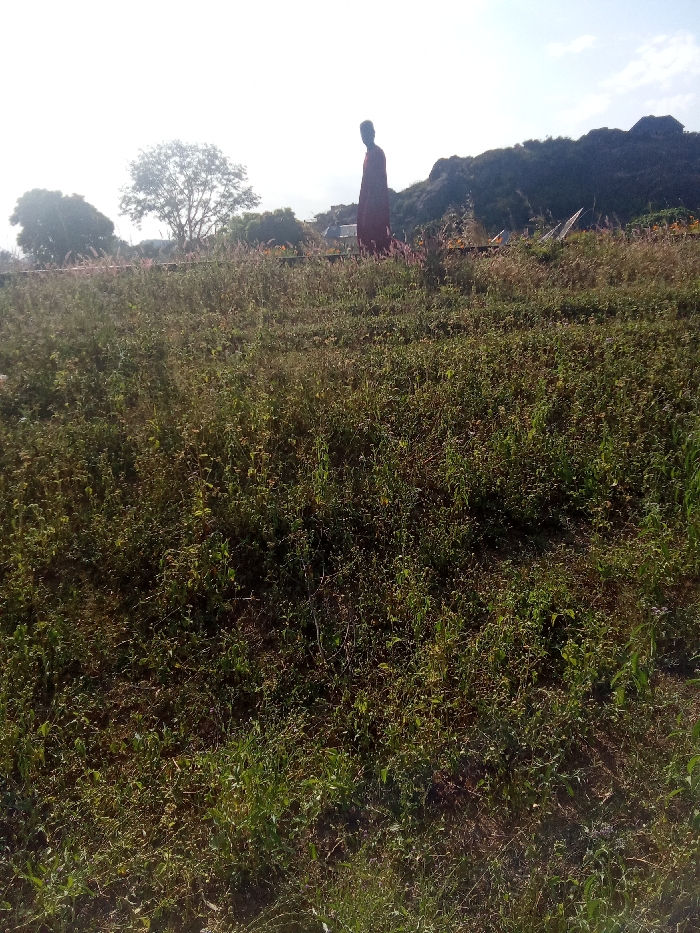 The image depicts an outdoor scene in Gura Top, Nigeria, characterized by a large field of low-lying, mixed green and brown vegetation in the foreground. At the mid-ground, a single individual stands upright, facing right, wearing a long, reddish-brown robe. This person is positioned on a slightly elevated patch of ground or a distant path. In the background, from left to right, are several trees, the faint outlines of distant structures, and a prominent, dark rocky hill or outcrop. The sky is bright and hazy, indicating daylight conditions. No discernible interactions or specific actions beyond the individual's stance are visible. The environment appears rural or semi-urban, with undeveloped land in the immediate foreground and natural features and distant human habitation in the background.