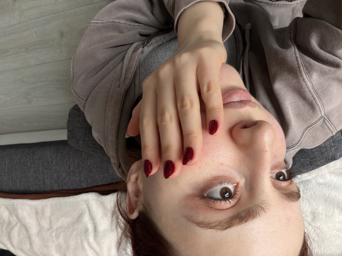 A woman lies with her face turned toward the camera, partially obscured by her left hand. Her fingernails are painted a dark red. She is wearing a gray hoodie with a lighter gray shirt underneath. Her eyes are wide and brown, and her eyebrows are light. She is lying on a white surface next to a gray cushion or blanket. A section of brown fabric is also visible in the bottom left corner. The overall composition is at an unusual angle.