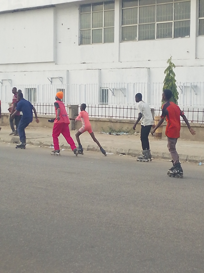 - "A group of six people are rollerblading on a street adjacent to a large, white building" by FM-WfIwR2, licensed under CC BY 4.0