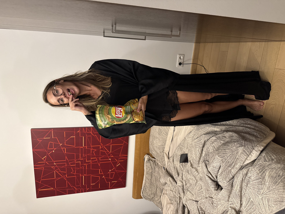 A woman wearing glasses and a black robe stands in a bedroom, holding a bag of Lay's potato chips. She has a chip in her mouth. A modern art piece in shades of red hangs on the wall. A bed covered with a patterned duvet sits beneath her. A mobile phone rests on the bed. A wall-mounted wardrobe and a power outlet are visible in the background.