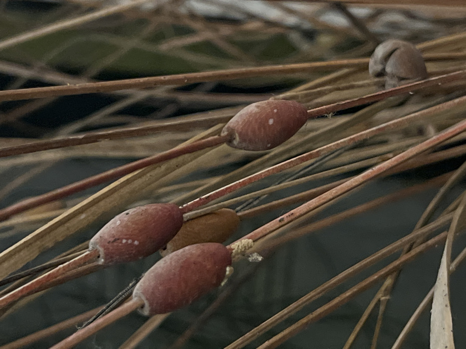 Several brown, oval-shaped objects with light speckles are attached to thin brown stems