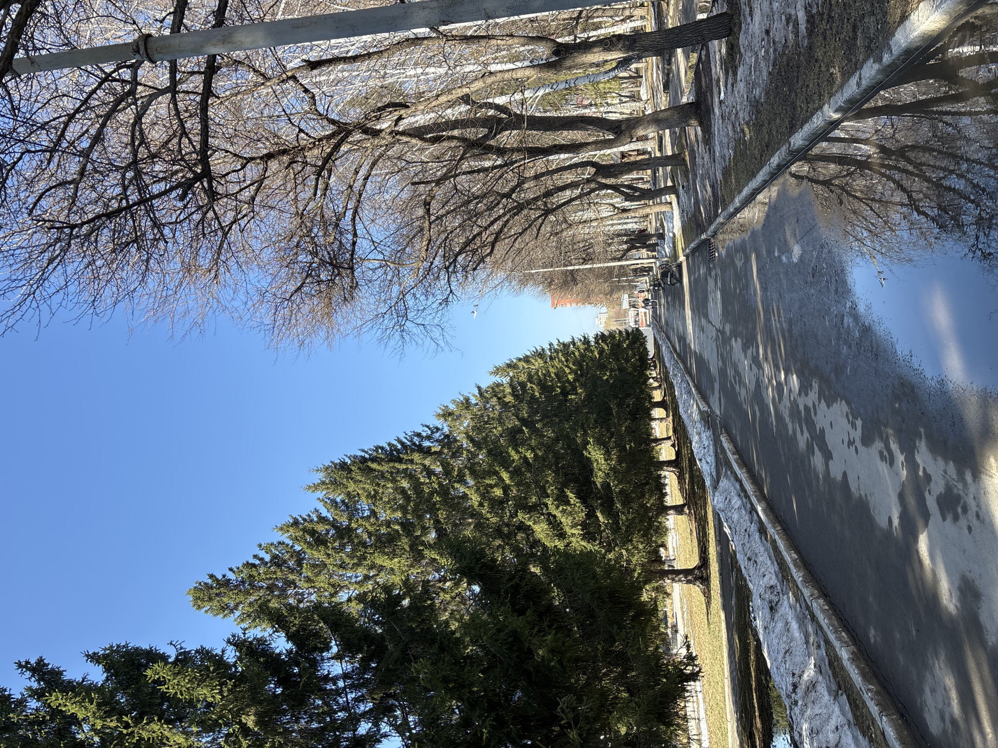 The image captures a street scene in Yekaterinburg, Russia, characterized by a clear, blue sky above and a mixture of deciduous and evergreen trees lining the roadside. Bare-branched deciduous trees dominate the upper portion of the frame, while evergreen trees are situated in the lower half. A paved road runs through the center, reflecting the sky and trees due to residual water on its surface, indicating recent precipitation. The roadside is bordered by what appears to be a low wall or curb covered in patches of snow. The scene suggests a late winter or early spring season in a urban park.