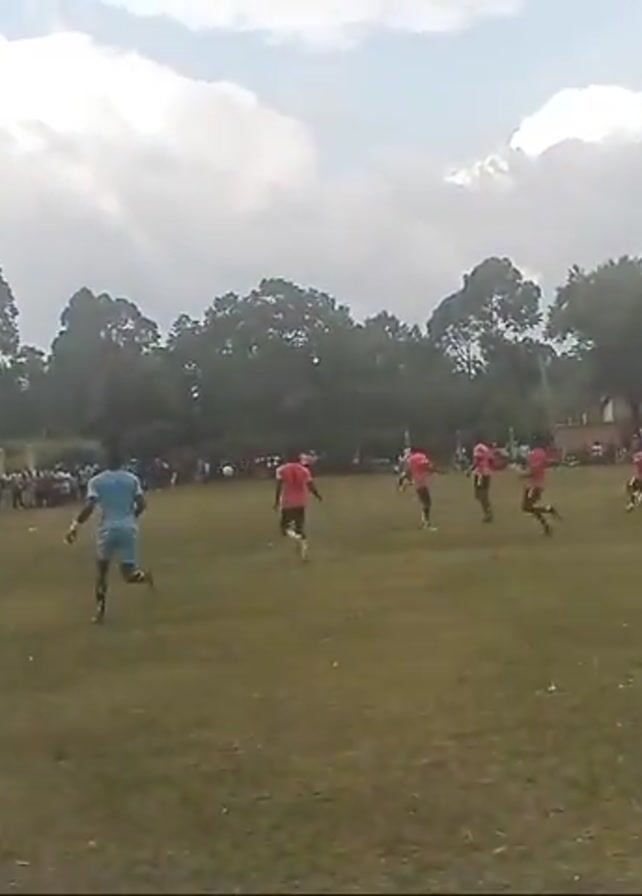 soccer game in progress. Several players wearing red jerseys and several players wearing blue jerseys are running on a grassy field. There is a soccer goal on the left side of the screen, and there are trees in the background. People are watching the game from the sidelines. The sky is cloudy.