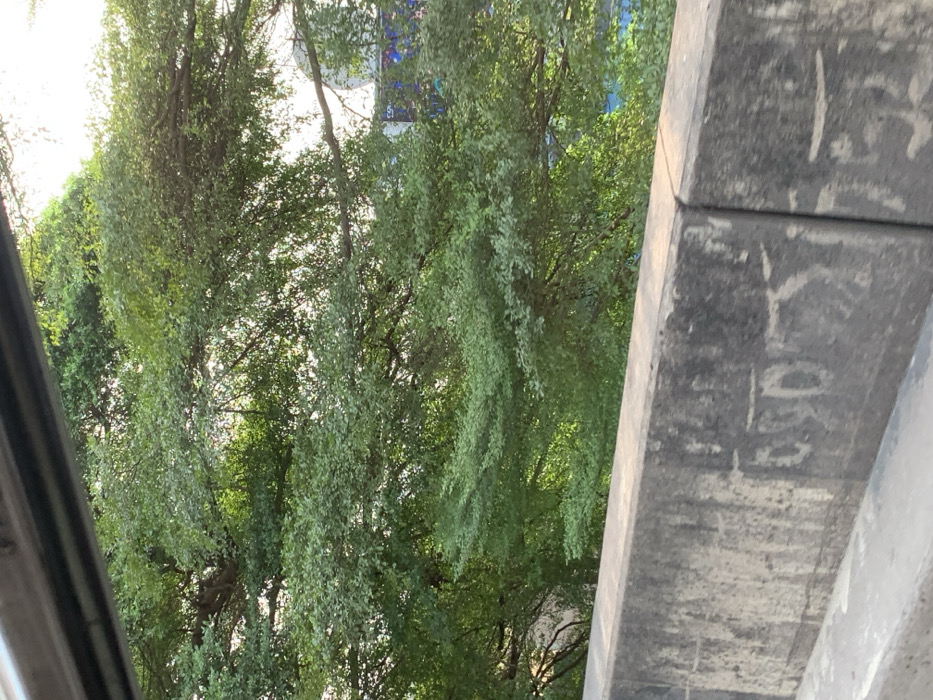 The image presents a view through a structure, possibly a bridge or a building frame. Dense, green trees fill the middle ground, their branches and leaves obscuring a building partially visible in the background. To the right, a weathered, gray concrete structure exhibits etched or painted markings. A partial view of a dark-colored interior element frames the left side. The lighting is bright, suggesting an outdoor daytime scene.
