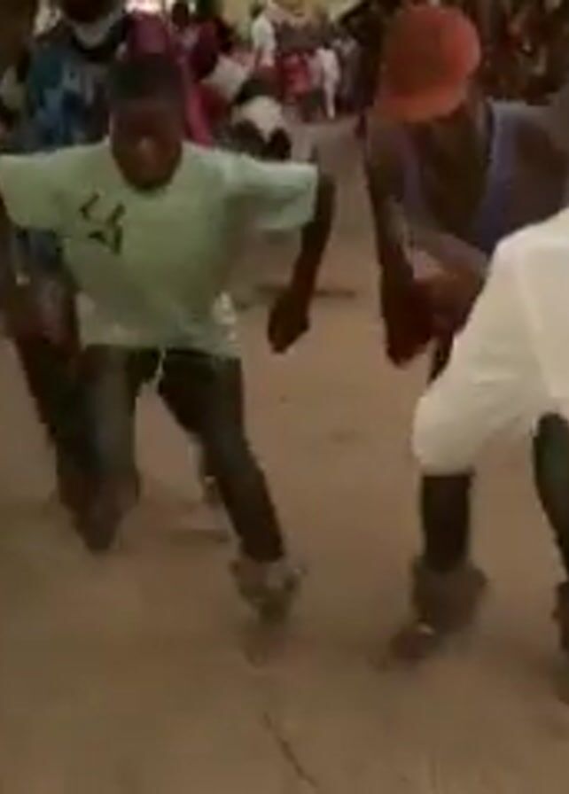 A group of dancers wearing colorful, traditional costumes perform in a dusty area. Some of the dancers have objects tied to their ankles, which create sound as they move. A person in a white shirt and a hat is positioned in the foreground, possibly filming or observing the performance. Behind the dancers, a crowd of people watches. The scene appears to be a cultural celebration taking place outdoors, likely in a village or rural setting.