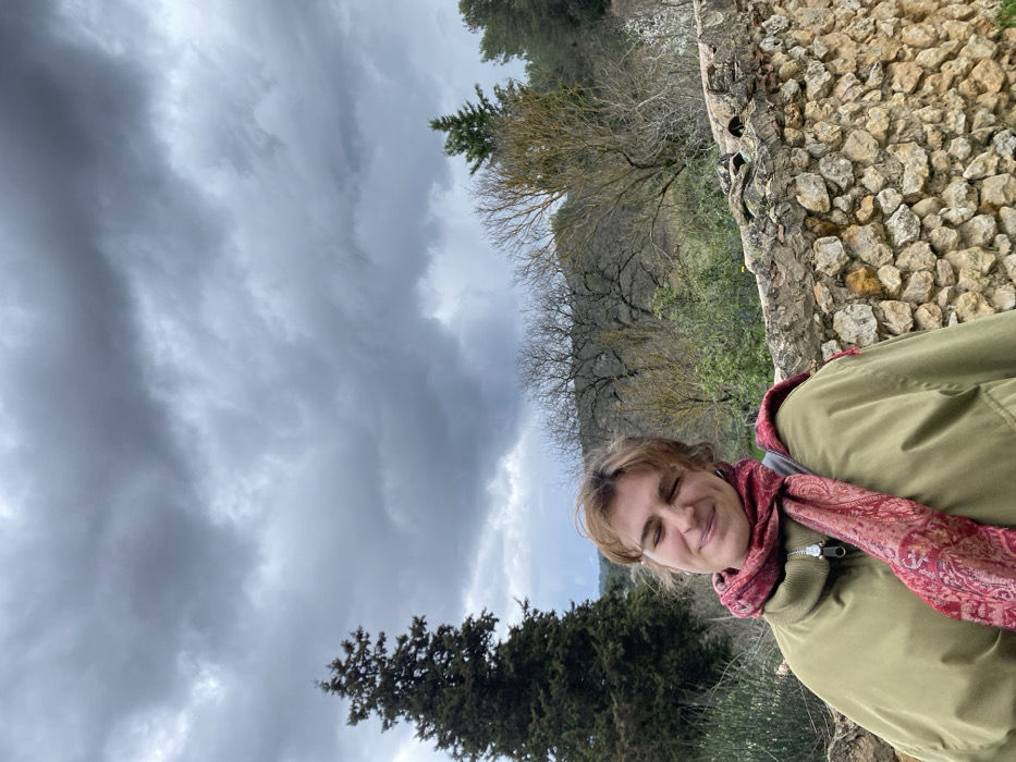 An individual is depicted in Gargas, France, positioned centrally in the lower half of an outdoor, rural scene. The person, with light brown hair, is wearing an olive-green bomber jacket and a red, patterned scarf. Their eyes are closed, and a subtle smile is evident. Behind the individual, a low stone wall constructed from irregularly shaped, light-colored stones with a dark tile coping spans the mid-ground. Beyond this wall, the environment consists of a landscape with various trees: a tall, dark green coniferous tree on the far left, and multiple deciduous trees with sparse, light-colored foliage, suggesting late winter or early spring. In the background, a tree-covered hillside is visible under a heavily overcast sky composed of dense, dark grey clouds.
