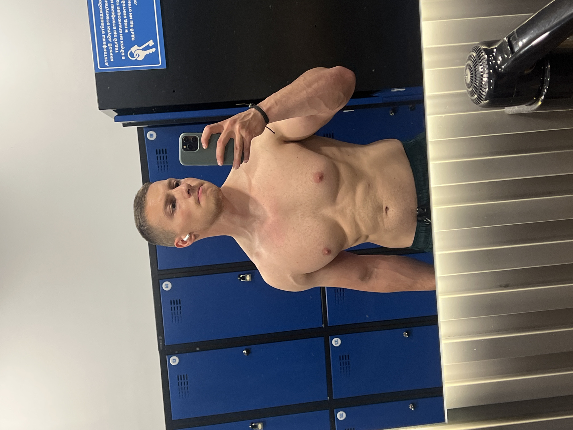 A muscular man is taking a selfie in a gym locker room. He is shirtless and wearing what appears to be gym shorts. He is holding a smartphone in his left hand. An earbud is visible in his left ear. The background consists of blue lockers with small numbered metal plates and a hair dryer. On one of the lockers above, there's a sign in a Cyrillic alphabet.