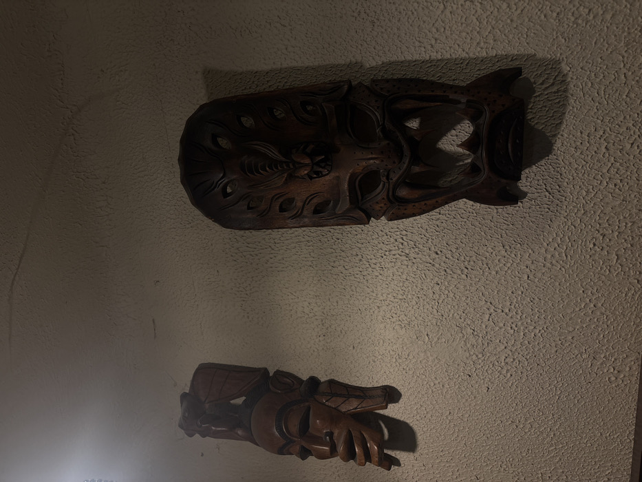 Two dark brown, carved wooden masks adorn a textured wall. The upper mask is elongated with ornate, curling details. The lower mask appears to depict a human face and hands, also carved with intricate designs. Both masks are casting shadows on the wall, suggesting a light source from above. The wall's texture is rough and slightly uneven, adding to the overall visual interest.
