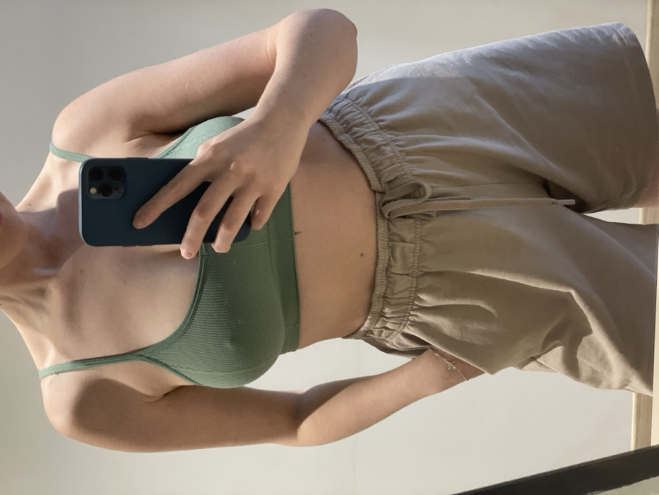 A person is depicted from the upper chest to mid-thigh, standing in an indoor setting against a plain light-colored wall. The individual is wearing a ribbed, light green bralette with thin straps and light brown or beige drawstring shorts. A dark blue smartphone in a protective case is held in the right hand, obscuring the upper face and central chest area; the phone's multi-lens camera module is visible. The left hand is placed casually in the left pocket of the shorts, revealing a thin, silver-colored bracelet on the left wrist. The background is a uniform light tone, with a dark vertical line or object partially visible on the far left edge of the frame. The scene takes place indoors, likely within a private residence or changing room, in the city of Unknown, Unknown.