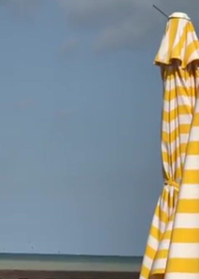 beach scene. In the foreground, a brown wooden railing partially obscures the view of the water. To the right of the frame, a closed yellow and white striped beach umbrella stands tall. The sky above is blue with a few scattered clouds. The ocean is visible in the distance.