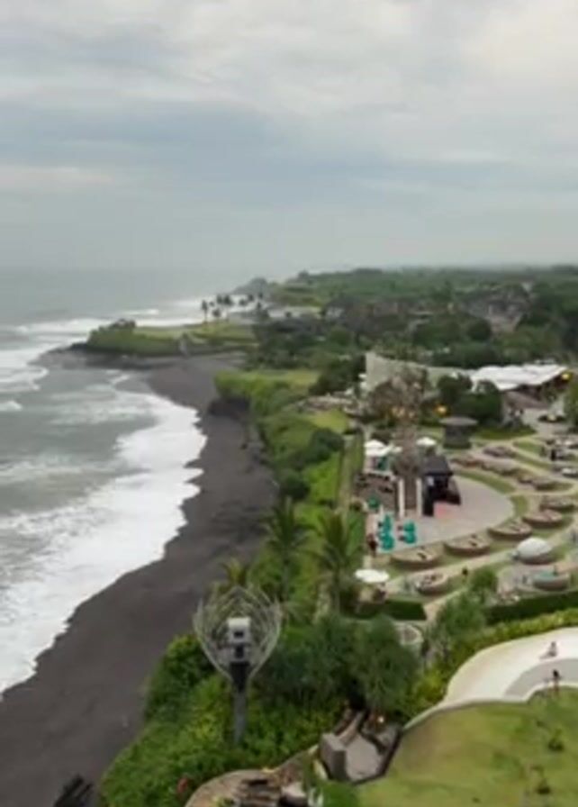 From an elevated perspective, the video presents a panoramic view of a coastal resort, a black sand beach, and the ocean under a cloudy sky
