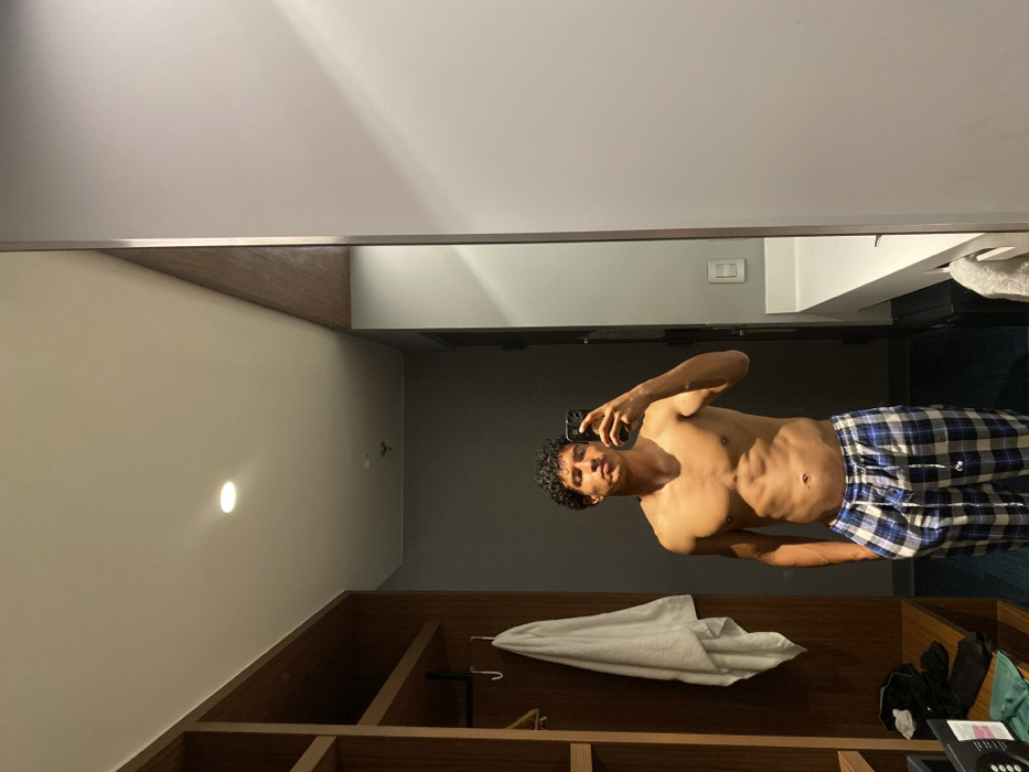 A shirtless man in blue and white plaid pajama pants takes a mirror selfie. He's in a hotel room with gray walls and wooden shelving holding a white towel and other items. A small, round light is visible on the wall near the shelving. An electrical outlet is also visible on the wall next to an open doorway leading to another area of the room. The mirror reflects the hallway and ceiling.