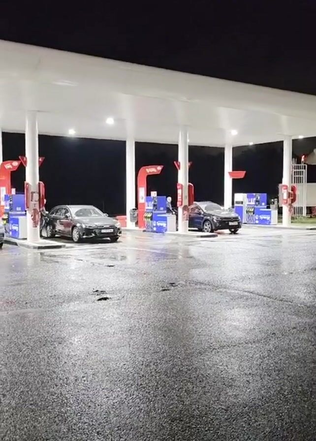 The scene is a gas station at night. The ground is wet, reflecting the light from the overhead canopy. The canopy is supported by white pillars and has red accents around the gas pumps. There are three cars parked at the pumps: a white van on the left, a gray sedan in the middle, and a dark-colored SUV on the right. A person is standing at the middle pump, presumably filling up their car. In the background, a white vehicle is on a trailer, and the sky is a dark, solid color, indicating nighttime.