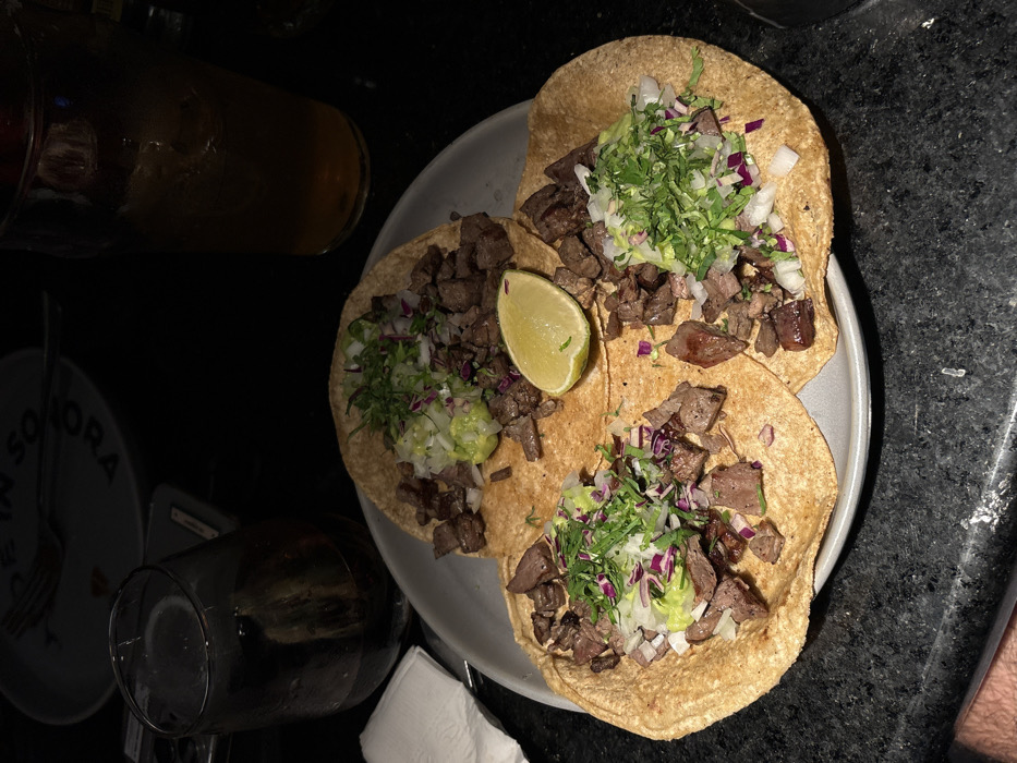 Three tacos fill a plate. Each taco is comprised of a golden tortilla topped with chunks of meat, diced white onion, guacamole, cilantro, and red cabbage. A lime wedge rests on the top taco. A tall glass of iced tea and a short glass of dark liquid sit beside the plate. A small plate with “MADE IN SONORA” printed on its rim is also visible. The dark background is speckled with grey.