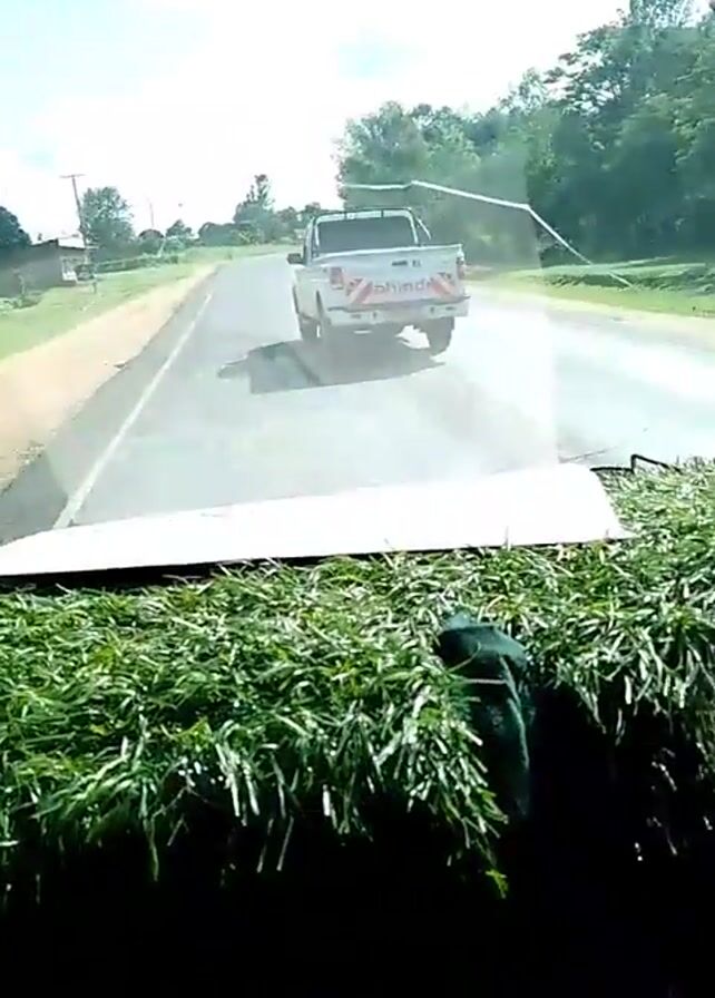 view through the windshield of a vehicle traveling on a paved road. In the distance, a white pickup truck drives ahead in the same direction. Two people are walking on the side of the road. The weather appears sunny, and trees line the side of the road. A green object, possibly a decorative item, is visible at the bottom of the windshield.