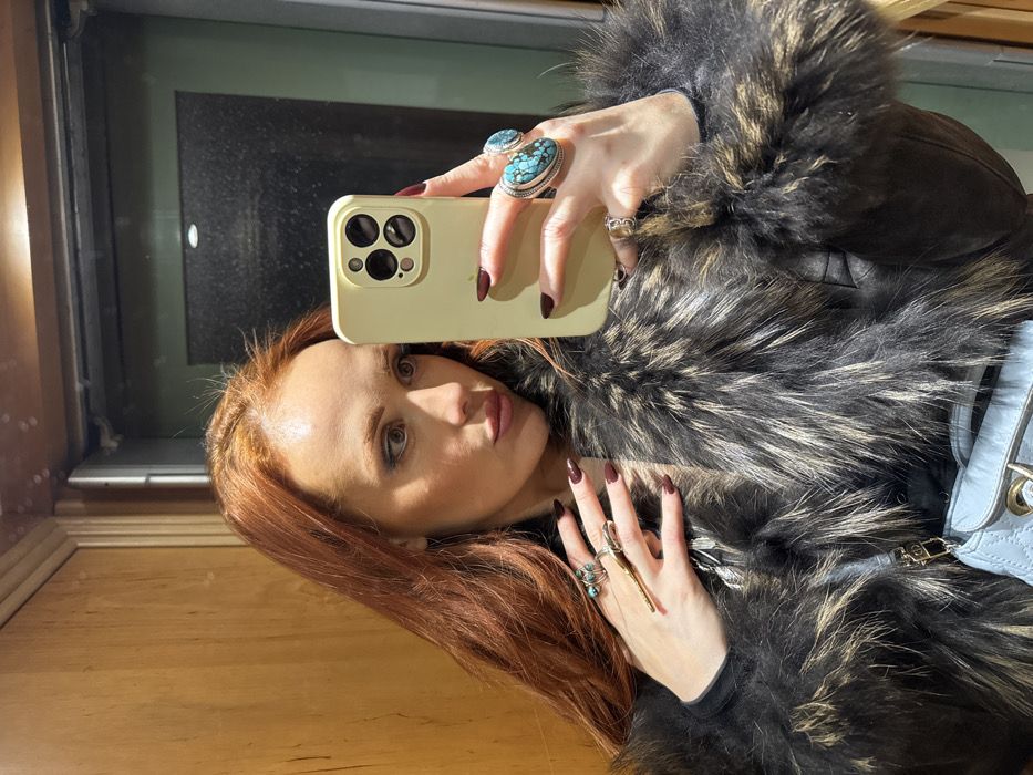 A selfie shows a fair-skinned woman with auburn hair. She holds a yellow-cased phone, adorned with several turquoise rings on both hands. She wears a fur-trimmed coat. The background features a dark window and light-colored wood paneling. The overall image appears to be taken in a room with reflective surfaces, suggesting it is a mirror selfie.
