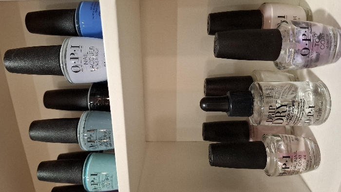 - "The image displays an indoor scene featuring two white shelves laden with various OPI brand nail care products" by FM-5Zve72, licensed under CC BY 4.0