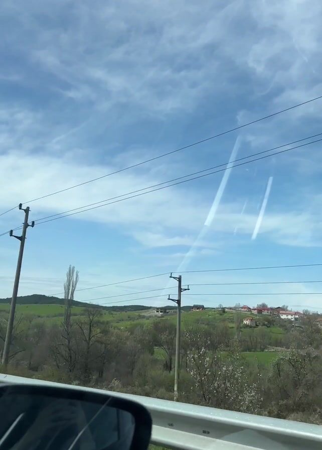 A car is driving on an asphalt road surrounded by green fields, trees, and a blue sky with scattered clouds. The car's side mirror and dashboard are visible. There is a metal guardrail along the side of the road. Power lines run alongside the road.