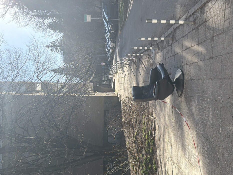 - "An outdoor urban scene in Sofia, Bulgaria, depicts a worn, black upholstered swivel recliner chair positioned on a cracked concrete sidewalk in the foreground" by FM-A1Ftg1, licensed under CC BY 4.0