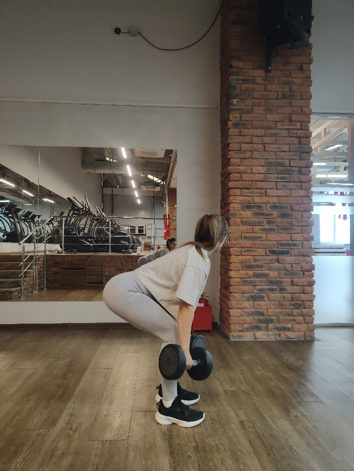 In a gym setting, a woman is performing a dumbbell Romanian deadlift