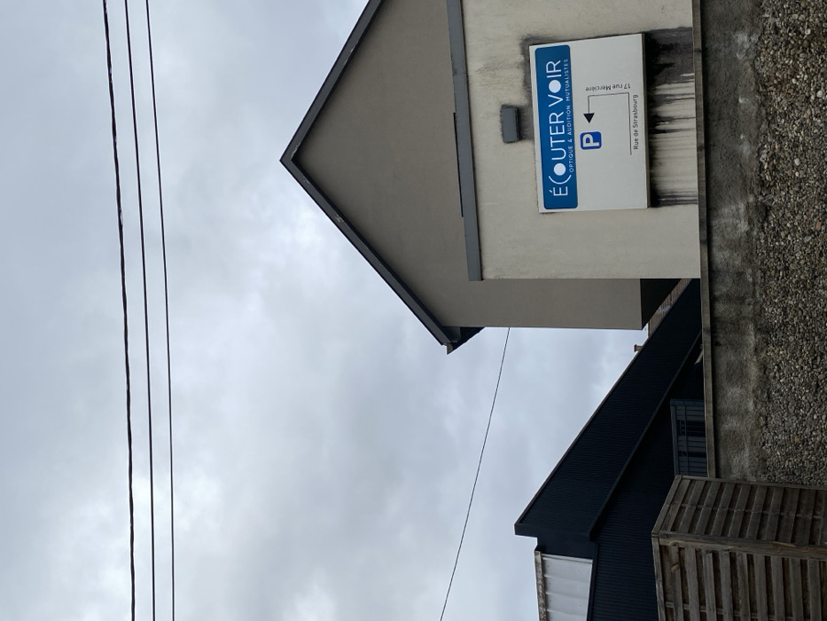 The image displays an exterior urban scene in Erstein, France, under an overcast sky. The upper third of the frame is dominated by a uniform grey, cloudy sky, crossed horizontally by three dark, thin utility lines. On the right, a multi-story building features a light brown/tan upper facade culminating in a dark-colored pitched roof. Below this, the building transitions to an off-white/cream facade where a rectangular white sign is mounted. This sign, lettered in blue, reads "ÉCOUTER VOIR OPTIQUE & AUDITION MUTUALISTES." Below the business name, a blue 'P' symbol (indicating parking) with a left-pointing arrow is present, accompanied by "17 Rue Mercière" written vertically and "Rue de Strasbourg" written horizontally. Multiple dark, vertical streaks of grime are visible on the building's facade directly beneath the sign. To the left, a darker-colored building, possibly with a black corrugated or paneled facade, presents a steep, angled roofline. This structure is partially obscured by a light brown wooden slat fence in the mid-ground. A low, grey concrete wall with an exposed aggregate (pebbled) finish runs across the lower portion of the image, serving as a foreground barrier. No individuals or dynamic actions are depicted.