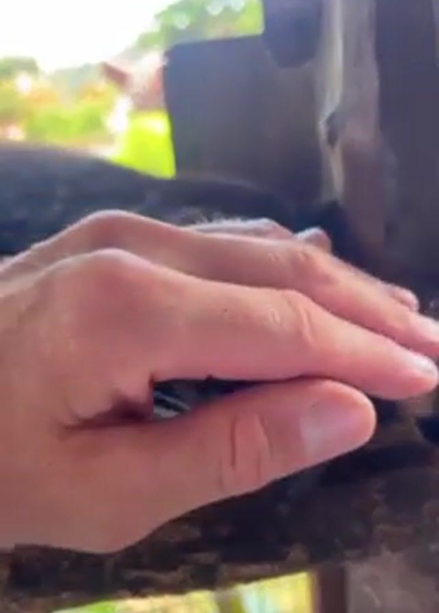 A close-up shot shows a civet cat lying on a wooden surface inside a cage. Its fur is dark brown and black, with white whiskers and light brown fur around its face. A hand reaches in and gently strokes the top of the civet's head. The civet slowly opens its eyes, appearing drowsy but allowing the touch. The background shows a blurred view of greenery and buildings, suggesting an outdoor setting.