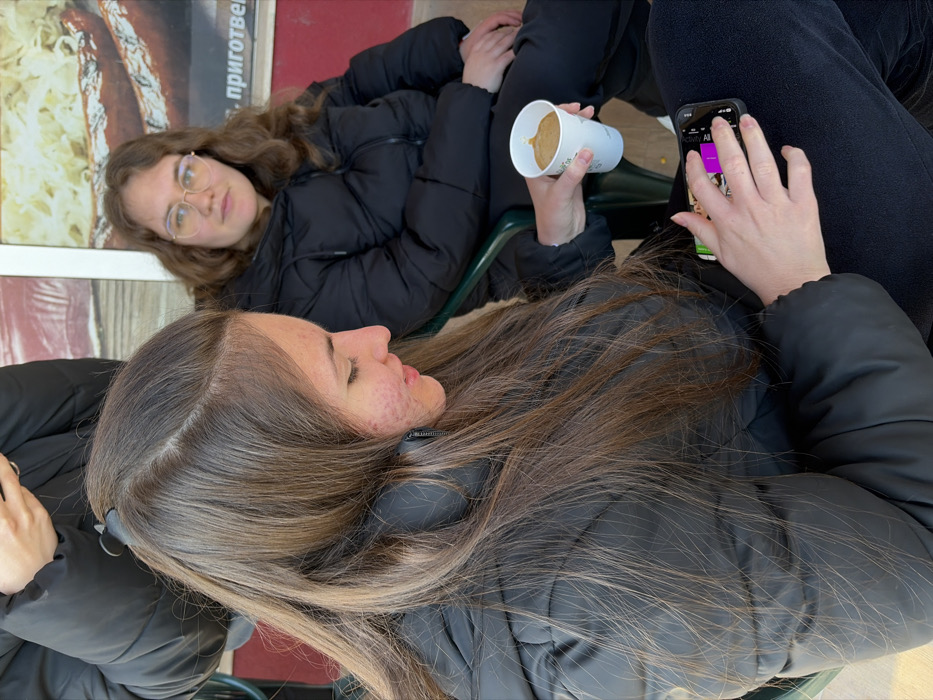 Three individuals are observed in an outdoor or semi-enclosed seating area in Cherven Bryag, Bulgaria. In the foreground, a young female with long, straight brown hair, styled with a side part, is seated. She wears a black puffer jacket and dark pants. Her head is tilted downwards, focusing on a black smartphone held in her left hand and resting on her lap. The phone screen displays various graphic elements, including a magenta rectangular block. In her right hand, she holds a white paper cup containing a frothy, light brown beverage. Multiple red blemishes are visible on her right cheek and jawline. To her right and slightly behind, a second young female is seated. She has medium-length curly brown hair, wears light-framed eyeglasses, and a black puffer jacket. She looks towards the left with a neutral expression, her hands resting in her lap. Partially visible on the far left, behind the foreground subject, is the top of a third person's head and shoulder, also wearing a black puffer jacket and appearing to hold a dark-colored phone. The individuals are seated on green-colored chairs. The background features a red wall or partition with a large poster or window display depicting food items. Specifically, images of grilled sausages with white chopped cabbage are prominent. Partial Cyrillic text reading "ПРИГОТВЕ" is visible on the display, indicating a food service establishment. The scene is illuminated by natural daylight.