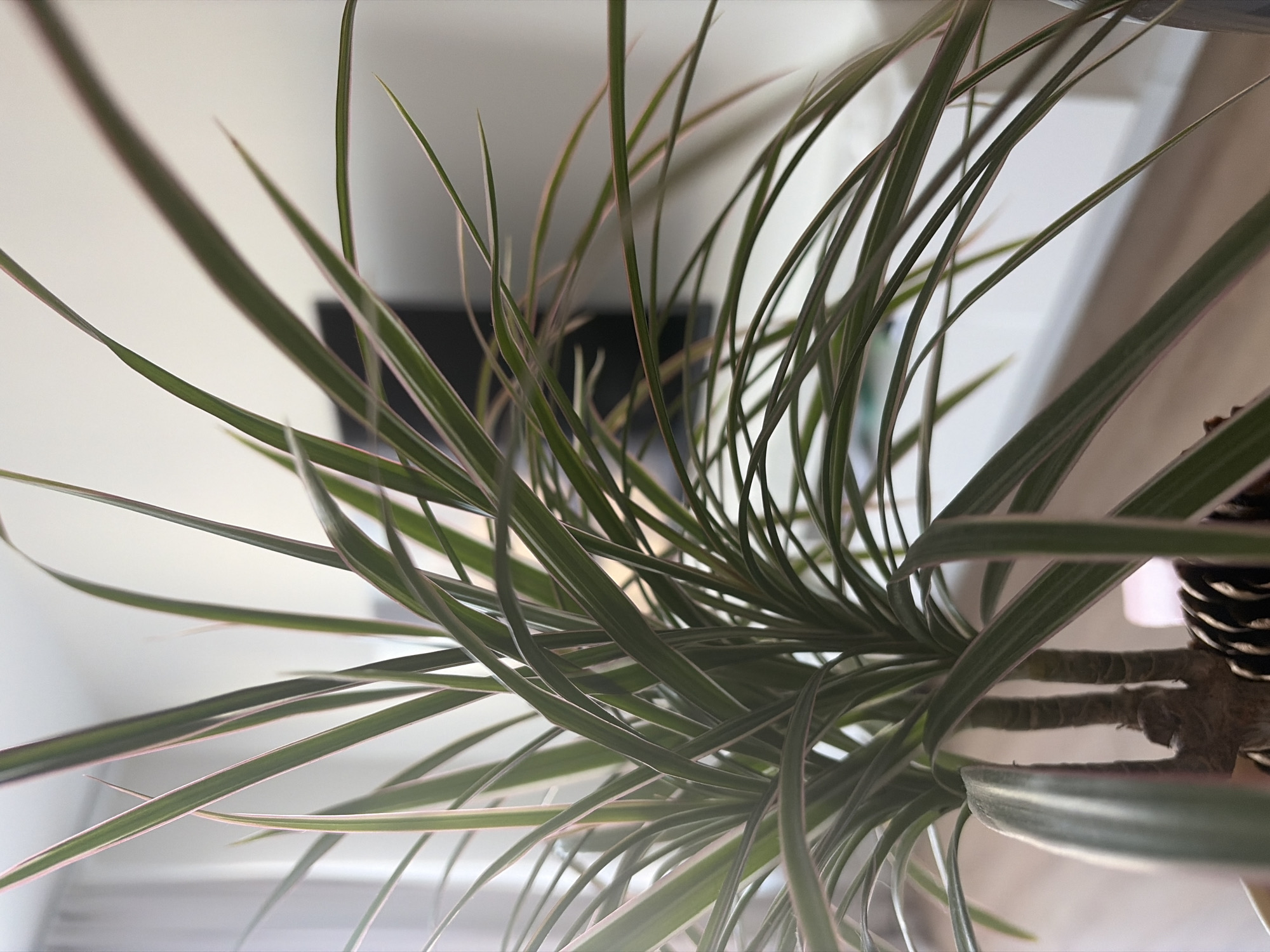 The image captures an indoor residential scene in Yanino-1, Russia. The foreground is dominated by a sharply focused Dracaena marginata houseplant, displaying numerous slender, lanceolate leaves with a dark green center and distinct reddish-pink margins. Multiple thick stems are visible at the plant's base, situated within a partially obscured, textured container. The background is rendered with a shallow depth of field, appearing as a blurred interior space. A predominantly white wall serves as the backdrop, against which a dark, rectangular object, consistent with a television screen or a piece of furniture, is discernible. Diffuse natural light appears to originate from the left side of the frame, possibly from a window covered by a translucent curtain or blinds. No individuals or specific actions are depicted.