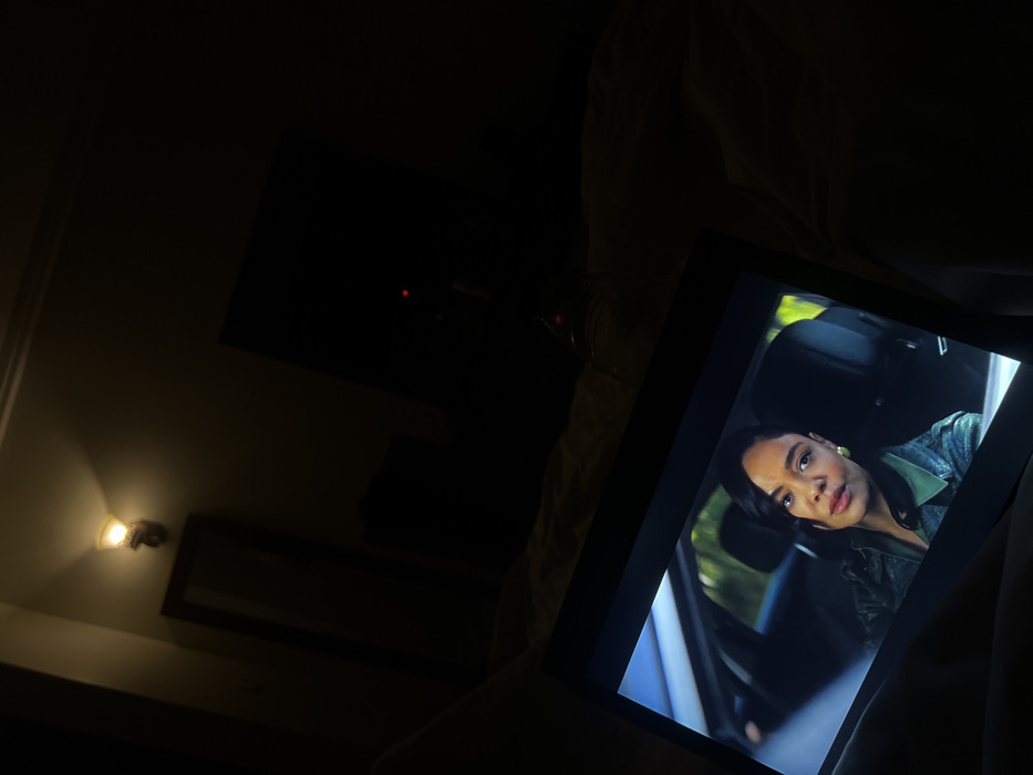 In a dimly lit room, a tablet screen illuminates with a scene of a woman in a car. The woman has dark hair and wears a green collared shirt. A desk lamp casts a soft glow on the wall behind the tablet. Further in the background, a TV mounted on the wall has a red indicator light. Below it is what appears to be an air conditioning unit. The room is dark and contrasts sharply with the bright screen.