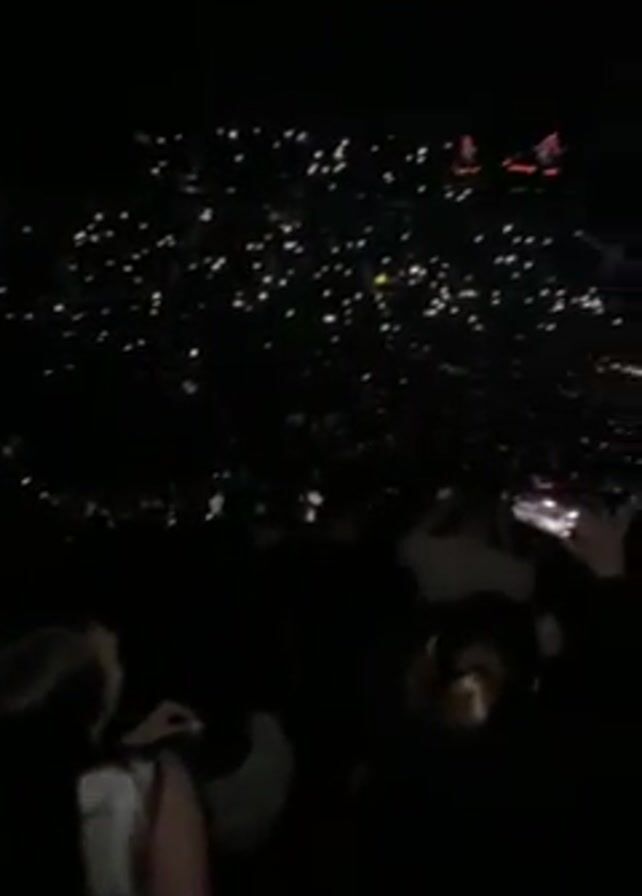 concert from a high vantage point. Many people are in the audience, holding their phones up, presumably recording the performer on stage. The stage is lit with spotlights. It is dark. The video is shaky.