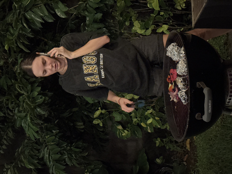An adult female is observed at night, conducting an outdoor barbecue in Jimbaran, Indonesia. She stands in front of a black kettle-style charcoal grill, branded "CELCIOR & CO" on its grey handle. The grill contains several items wrapped in aluminum foil and unwrapped cut vegetables, including red and purple pieces, cooking on the grate. The woman, with dark hair parted in the middle, wears an oversized dark t-shirt featuring "KANGOL BRITISH" in a leopard print pattern, and dark shorts. Her left hand holds a light-colored smartphone to her left ear, indicating an active call. Her right hand grasps a pair of blue-handled tongs, poised over the grill. The background consists of dense, dark green foliage, with green grass visible in the lower left foreground. Artificial lighting illuminates the immediate area around the woman and the grill.