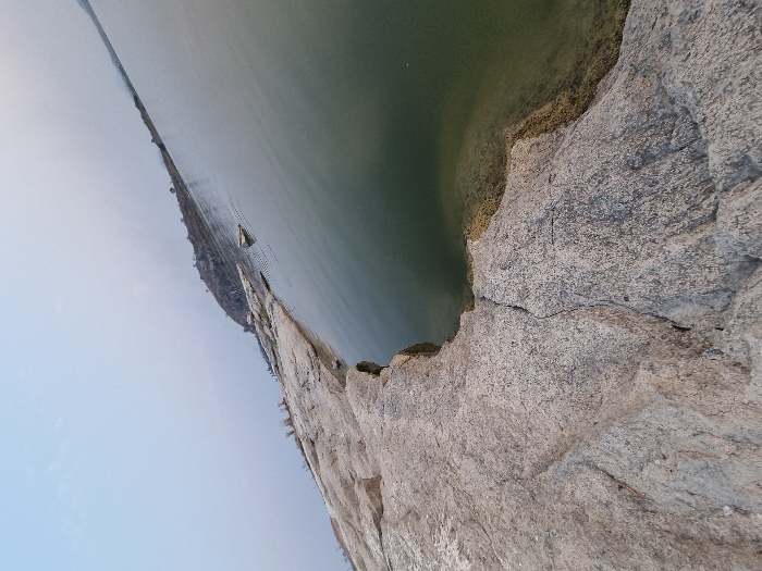 The image, captured from a diagonal perspective, depicts a static outdoor environment in Kammavaripalli, India. The immediate foreground is dominated by a light grey-brown rocky shoreline, characterized by fissures and an irregular, coarse texture. This rock formation extends to the left, forming the bank of a body of water. The water, appearing calm, displays a murky dark green coloration and reflects the overcast sky. Submerged rocks or vegetation are visible in the shallower areas directly adjacent to the rocky bank. A few isolated, darker rocks punctuate the water's surface further offshore in the midground. In the background, a low, rugged hill range with sparse, dark vegetation rises across the water, extending horizontally to the right. The sky overhead is a uniform light blue-grey, indicating diffused natural lighting conditions. No individuals, human activity, or animals are depicted within the frame.