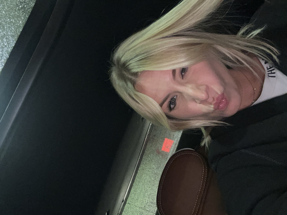 A selfie-style shot shows a blonde woman indoors, angled slightly. Her hair is windblown, and she is puckering her lips. She wears a white t-shirt with lettering on the upper right. A black hoodie covers the rest of her upper body. A brown car seat is visible below her. The ceiling is black. The image appears to be taken inside a car.
