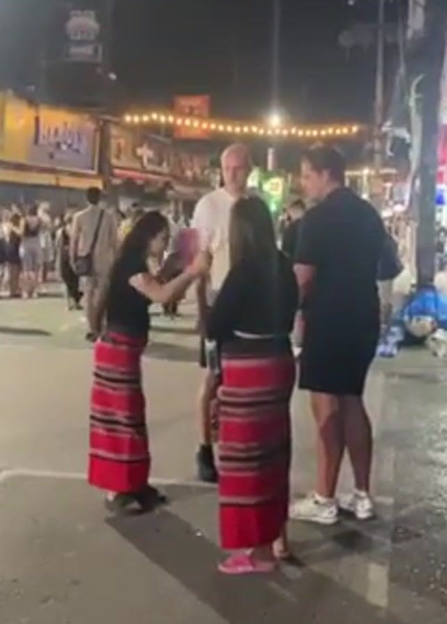 The video depicts an outdoor nighttime scene on a bustling street. The primary focus is a group of four individuals engaged in conversation. Two women, wearing matching outfits of black tops and long red skirts with striped patterns, stand facing two men. One of the men is wearing a white t-shirt and the other is wearing a black outfit. The street is crowded with people moving in both directions, and various shops and stalls are visible in the background, illuminated with bright lights and signs. Overhead, strings of decorative lights add to the vibrancy of the scene. The street surface is dark and appears to be asphalt. Overall, the scene suggests a lively and busy urban setting at night.