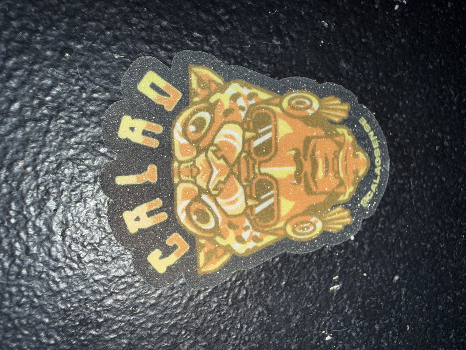 A sticker displays a stylized tiger face wearing sunglasses. The color scheme is primarily orange and yellow. "CALAO" is printed vertically on the left, while "DEFENSE" is written along the right edge. The sticker has a clear border with a sparkly finish. It is resting on a dark, textured surface.