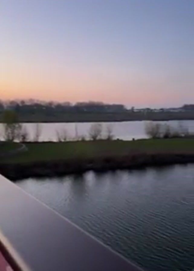 A short video taken from a bridge shows a body of water, potentially a river or canal, with a statue on one side and a small harbor on the other