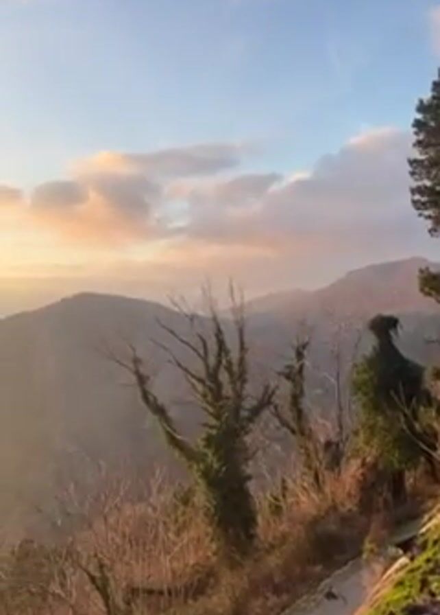 scenic view of mountains and a lake at sunset. The sky is a mix of blue and orange, with clouds scattered throughout. In the foreground, there are trees, some covered with ivy. A path is visible along the edge of the frame. As the camera pans, the sun becomes visible on the horizon. Two airplane contrails are also briefly seen in the sky.