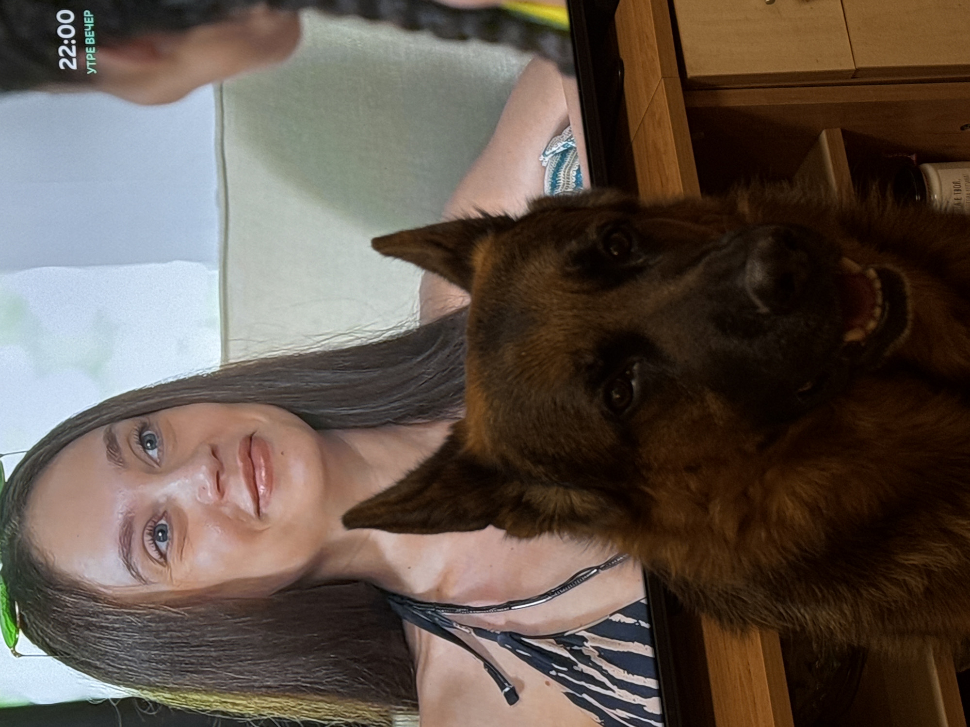 An indoor scene in Sofia, Bulgaria, features a German Shepherd dog positioned in front of a television screen. The dog, with dark brown and black fur and erect ears, faces the viewer with its mouth slightly open, revealing teeth. On the television screen, a young woman with long dark hair, blue eyes, and light skin is displayed from the chest up, wearing a black and off-white striped halter-neck top. She exhibits a subtle smile and looks towards the right side of the screen, where a portion of another individual with dark braided hair is partially visible. Green-tinted eyewear rests on the woman's head. The top right corner of the screen displays "22:00" and the Cyrillic text "УТРЕ ВЕЧЕР". The television rests on a light-brown wooden entertainment unit or cabinet, which includes shelves and drawers. A white jar with dark lettering is partially visible on one of the lower shelves to the right.