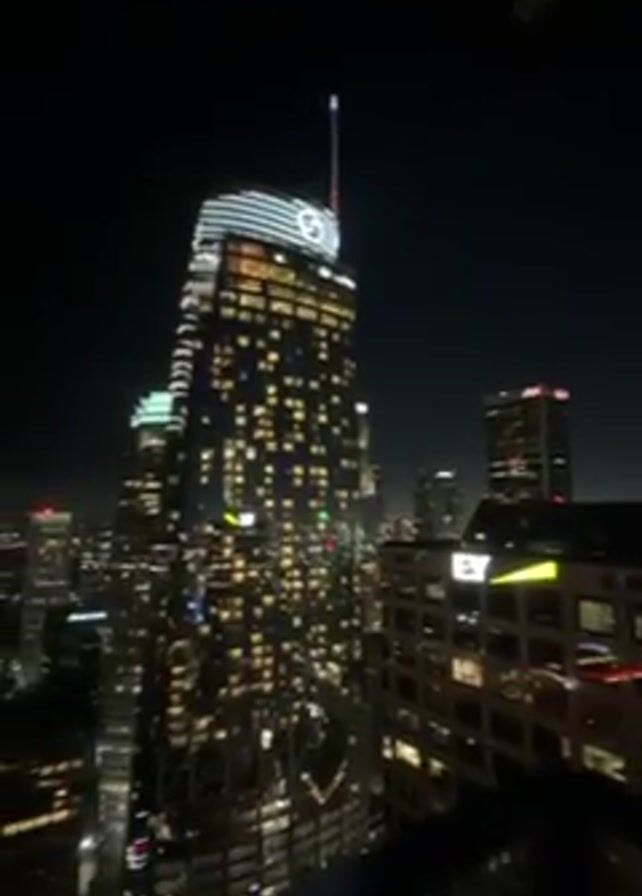 nighttime view of a city skyline. The camera pans from a tall building with a Mercedes-Benz logo to a wide view of the cityscape, revealing a major highway with heavy traffic. The city is brightly lit with numerous buildings and streets.