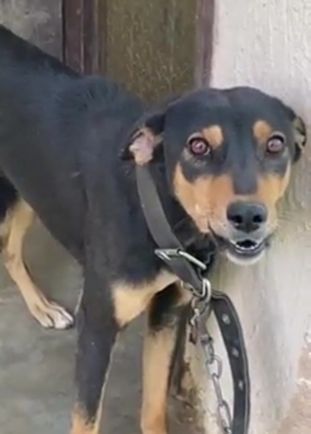 medium-sized dog, predominantly black with tan markings on its legs and face, standing on a concrete surface near a building. The dog is on a chain and wearing a black collar. It is barking, initially appearing aggressive, then becomes more subdued. The background features a door and the exterior wall of a building.