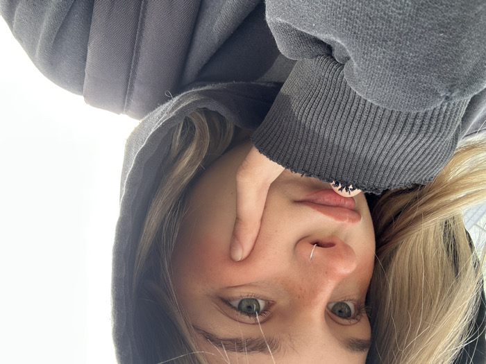 A close-up portrait features a young individual with fair skin, green eyes, and blonde hair, partially obscured by a dark grey hooded sweatshirt. The subject's right index finger rests against the right cheek, which exhibits a reddish hue and freckles. A small silver ring pierces the right nostril. The left hand, partially visible below the chin, displays a ring on one finger, and is covered by a frayed cuff of the sweatshirt. A black backpack strap crosses the subject's right shoulder. The background is uniformly white and overexposed, offering no identifiable features or landmarks to determine a specific location within the city of Vancouver, Canada.