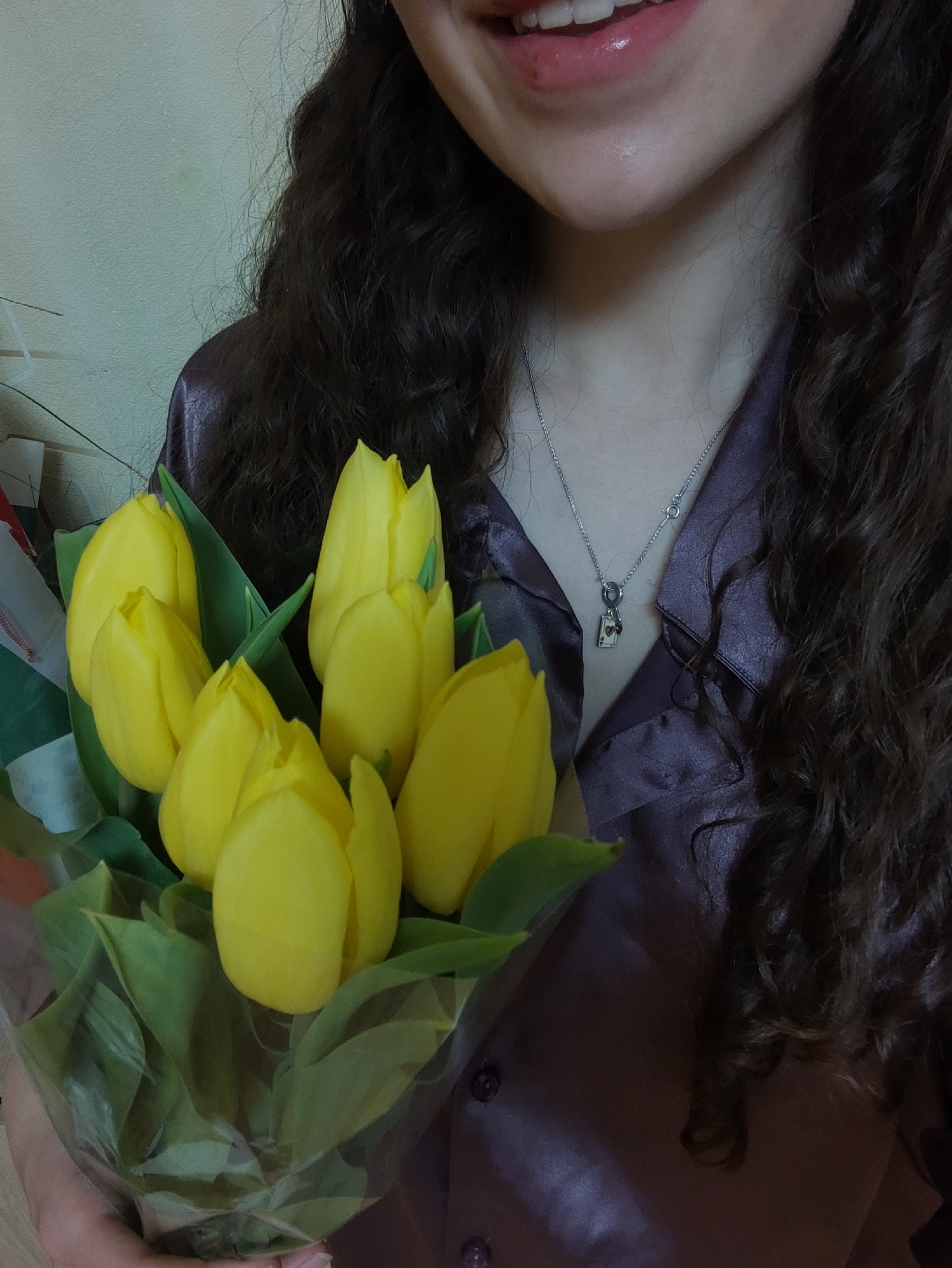 An indoor close-up photograph taken in the city of Sliven, Bulgaria, depicts a person holding a bouquet of yellow tulips. The subject's lower face, including a mouth with slightly parted, glossy pink lips revealing teeth, is visible, along with the chin, neck, and upper chest. Dark, curly hair frames the face and falls over the shoulders. The individual wears a dark purple or brown satin-like collared shirt with visible buttons. A silver chain necklace with a small pendant resembling an Ace of Hearts playing card, featuring an attached dark element, rests on the chest. The person's right hand, with visible fingers, grips the base of a bouquet containing approximately seven vibrant yellow, closed or partially opened tulips with prominent green leaves, encased in clear plastic wrapping. The background consists of a light, possibly pale green, textured wall.