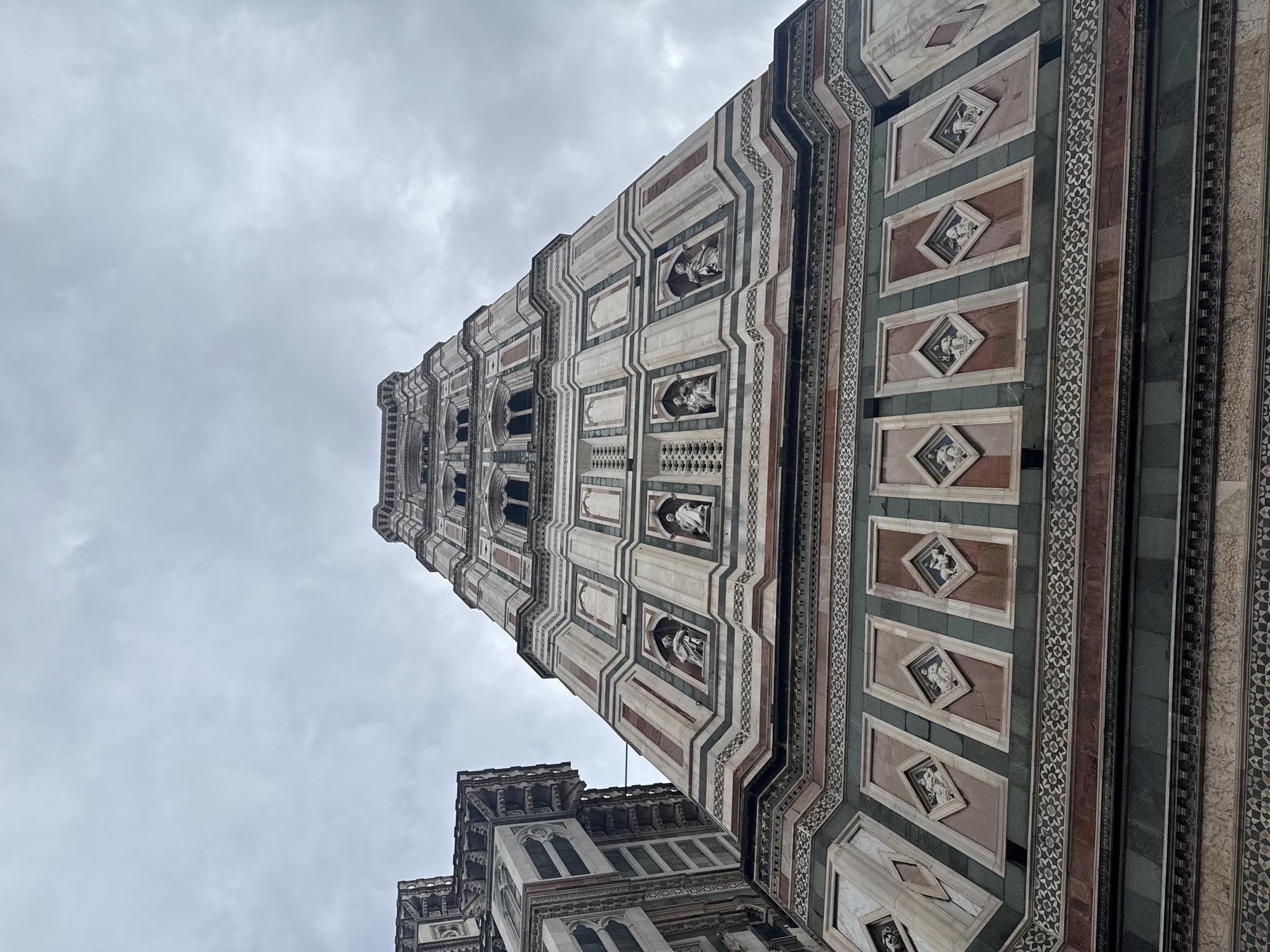 The image displays a low-angle view of Giotto's Campanile, a freestanding bell tower, situated in Florence, Italy, adjacent to the Florence Cathedral (Santa Maria del Fiore). The tower is clad in polychrome marble, exhibiting alternating bands of white, green, and reddish-pink, with intricate geometric and floral patterns. The visible lower levels feature a series of square and diamond-shaped panels containing bas-relief sculptures of human figures and symbolic representations. Above these, multiple niches house white marble statues. A section of the similarly clad Florence Cathedral is partially visible on the far left. The sky is overcast and grey, occupying the upper portion of the frame. No individuals, actions, or other distinct objects are present within the scene.