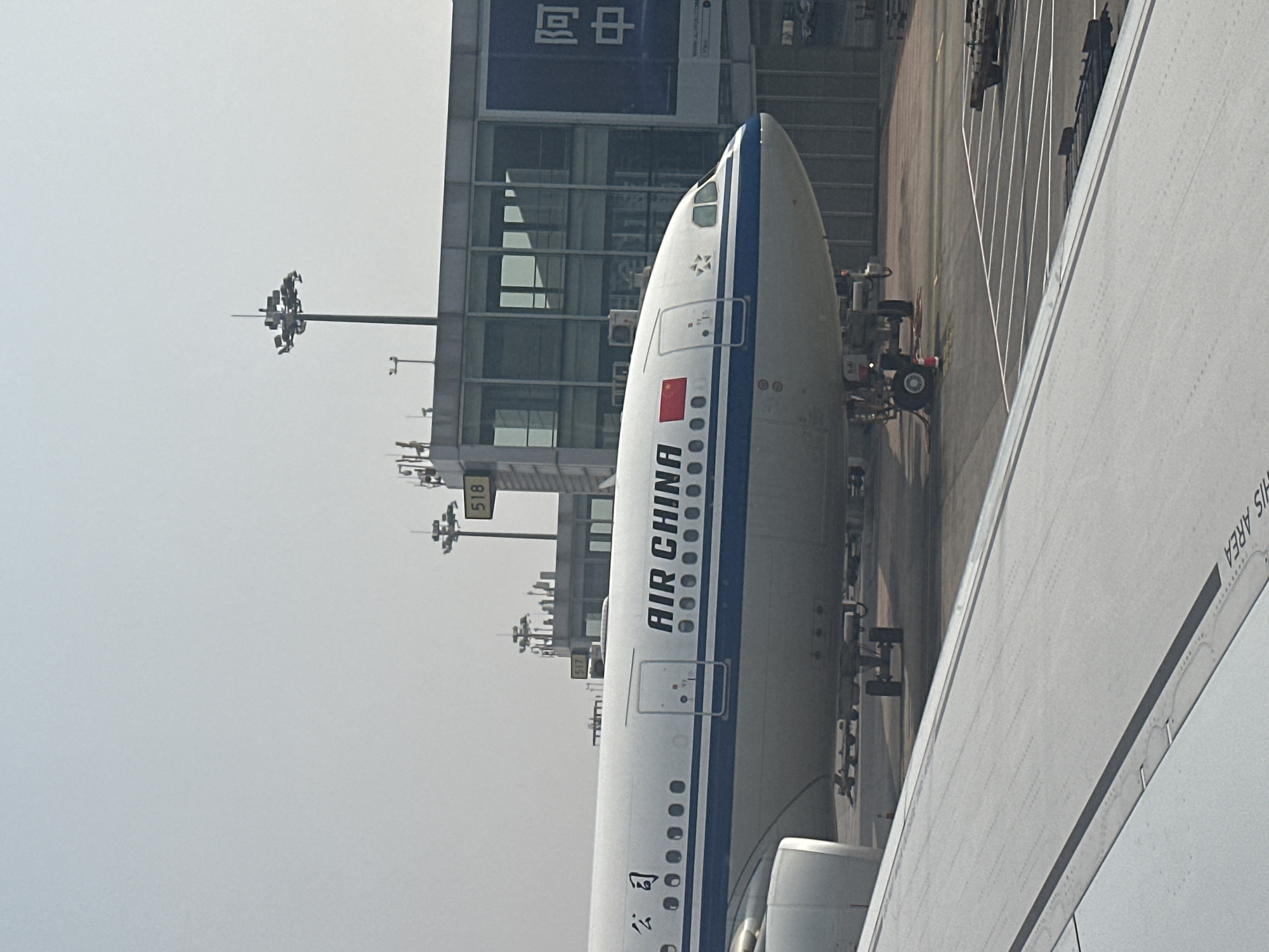 The image depicts an airport scene at Beijing Capital International Airport (PEK) in Shunyi District, China. A white Air China passenger aircraft, featuring its standard blue stripe livery, "AIR CHINA" text, Air China logo, and the Chinese national flag on its forward fuselage, is parked on the tarmac. The aircraft's nose, cockpit windows, and front landing gear with chocks are visible. A pushback tug is positioned near the nose wheel. In the background, a multi-story airport terminal building with a glass facade is present. A blue billboard with Chinese characters is mounted on the terminal. Two tall high mast light poles rise above the terminal; one clearly displays a yellow sign with the number "518," indicating a gate. Another yellow sign with "517" is visible on a lower structure, suggesting an adjacent gate. Various pieces of ground support equipment, including baggage carts and trailers, are scattered across the tarmac. The photograph is taken from the perspective of another aircraft, with a section of its light gray wing occupying the lower left foreground. Rivet lines and an "AREA" stencil (partially visible and reversed) are present on the wing surface. The sky is a uniform, light gray, suggesting hazy conditions. No individuals are visibly performing actions within the frame.