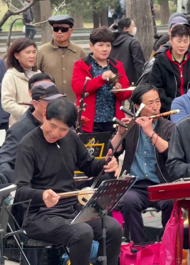 A group of older Chinese musicians play traditional instruments in a park