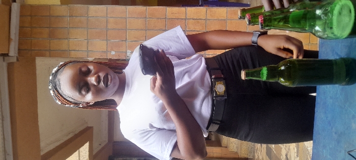 The image depicts a scene at an unspecified location within the city of Okura, Nigeria. A young adult female with braided hair adorned with white beads stands center-frame, dressed in a white short-sleeved t-shirt, black trousers, and a black belt with a prominent gold-faced, clock-like buckle. A dark-colored smartwatch or wristband is visible on her left wrist. She is looking down at and holding a dark-cased smartphone with both hands. In the foreground, on a blue-surfaced table, are several green glass bottles. One bottle, positioned centrally, is capped. To the right, at least two uncapped bottles contain a green liquid, with one showing some foam. A portion of another person's hand is visible on the far right, near the uncapped bottles. The background consists of a wall with light brown square tiles and structural building elements, including a beam and a pillar. A dark blue plastic chair is partially visible behind the bottles on the right.